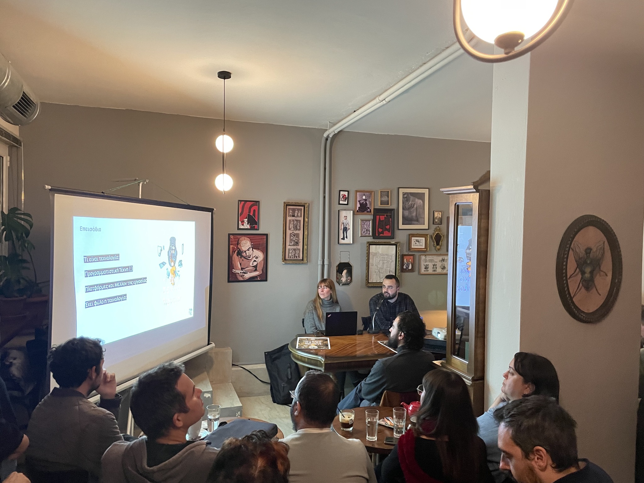 Μετά τις παρουσιάσεις ακολούθησε ανοιχτή συζήτηση με τον Βασίλη Βλαχοκυριάκο, καθηγητή στο Πανεπιστήμιο του Newcastle και μέλος του Open Lab Athens και την Ελπίδα Βαμβακά, δικηγόρο, πρόεδρο της οργάνωσης Homo Digitalis. Ο Βασίλης προχώρησε σε μια ανάλυση για το τι είναι τεχνολογία, πως την βλέπουν τα διάφορα ρεύματα σκέψης, πως αυτή επικαθορίζεται από το΄οικονομικό-κοινωνικό σύστημα στο οποίο ζούμε, ποιός αποφασίζει για τον σχεδιασμό της και με ποιόν συμφέρον και πως μπορούμε να κινηθούμε προς ένα πιο δίκαιο και συμπεριληπτικό σχεδιασμό της. Η Ελπίδα ανέλυσε την προσπάθεια προσαρμογής της κοινωνίας γύρω από τις τεχνολογικές εξελίξεις και τις προσπάθειες σε θεσμικό επίπεδο για την προστασία των κοινωνιών και των δικαιωμάτων απέναντι σε αρνητικές όψεις της τεχνολογίες. Ακολούθησε ζωντανή συζήτηση μαζί με το κοινό γύρω από τα ψηφιακά δικαιώματα, τις αρνητικές επιπτώσεις της τεχνολογίας, την τεχνητή νοημοσύνη και τα οικονομικά συμφέροντα που διαπλέκονται με την τεχνολογική ανάπτυξη.