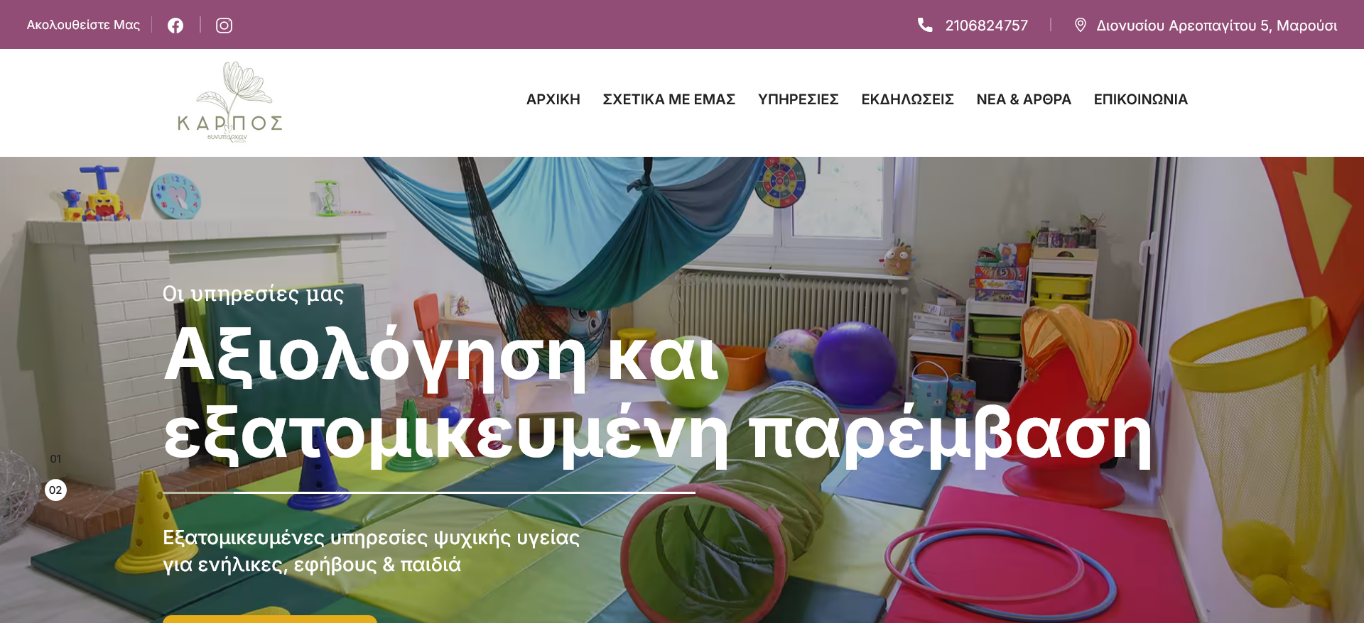 Δημιουργήσαμε την ιστοσελίδα του συνεργατικού χώρου ειδικών θεραπειών και δραστηριοτήτων Συνυπάρχειν – Καρπός στο Μαρούσι. Η ομάδα προσφέρει ψυχοθεραπευτικές και εκπαιδευτικές δραστηριότητες. Στον ιστότοπο παρουσιάζονται όλες οι υπηρεσίες, με αντίστοιχη φόρμα ενδιαφέροντος, η ομάδα και ο χώρος.